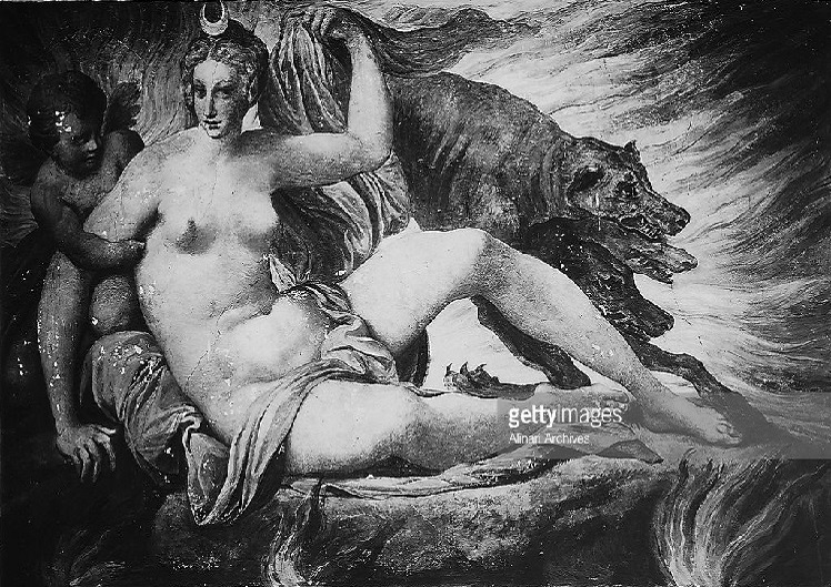 Diana, godin van de jacht, en Cerberus, "de hellehond"